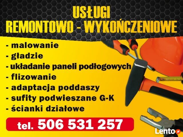 Oferuję usługi remontowo wykończeniowe gładzie , malowanie . układanie glazury i terakoty, układanie paneli podłogowych, docieplenia poddaszy wraz z adaptacją, montaż ścianek działowych i sufity podwieszane, drobne przeróbki elektryczne i hydrauliczne i inne prace związane z wykończeniem wnętrz . Remontuję jedno pomieszczenie jak i całe domy zapraszam do kontaktu tel.506 - pokaż numer telefonu - .Kiedy nie odbieram proszę o SMS to oddzwonię.Sprawdź zainteresowanie tym ogłoszeniem